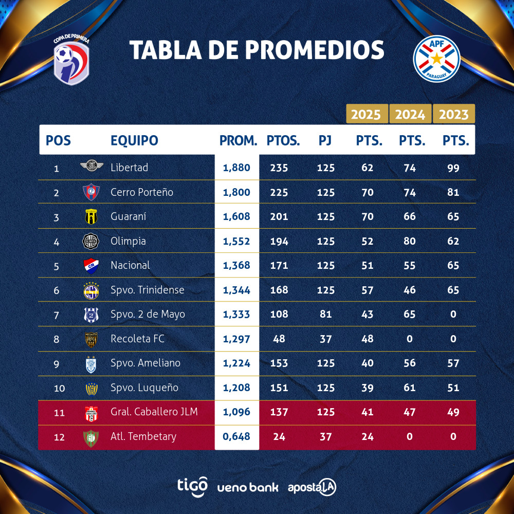 De los dos descensos previstos para esta temporada, uno ya está confirmado: Atlético Tembetary. Si el panorama no cambia drásticamente, el otro equipo que perdería la categoría sería Gral. Caballero de Juan León Mallorquín, lo que dejaría a Sportivo Luqueño un año más en la Primera División del fútbol paraguayo.