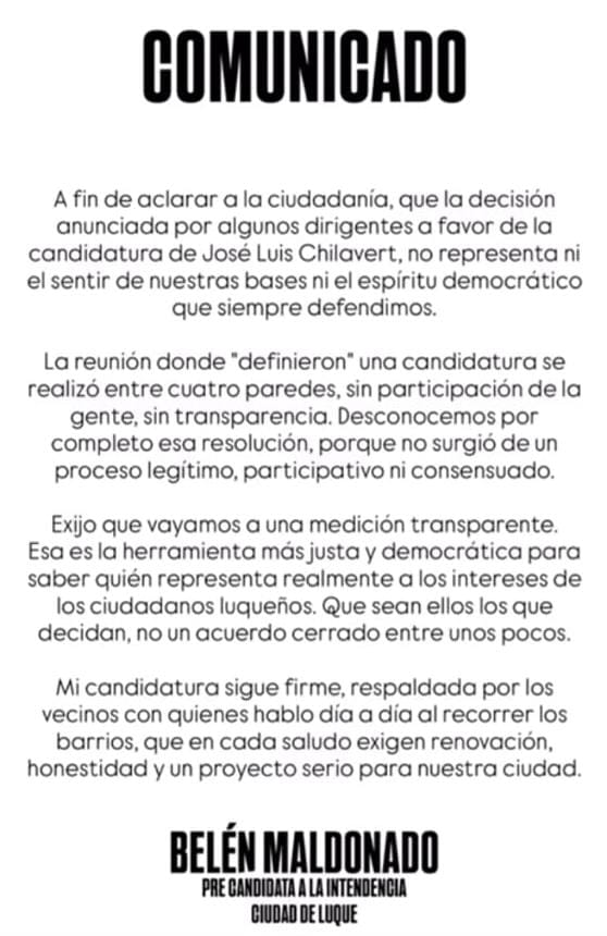 La interna dentro de la alianza Unidos por Luque volvió a tensarse tras un comunicado difundido por la concejala y precandidata a la Intendencia, Belén Maldonado, quien rechazó tajantemente la decisión anunciada por un grupo de dirigentes que manifestó su apoyo a la candidatura de José Luis Chilavert.