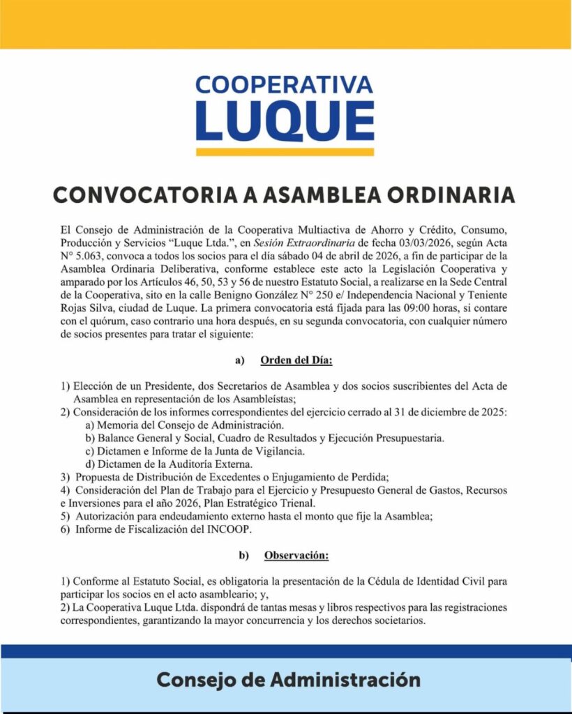 El Consejo de Administración de la Cooperativa Multiactiva de Ahorro y Crédito, Consumo, Producción y Servicios Luque Ltda., convoca a todos sus socios a participar de la Asamblea Ordinaria Deliberativa, que se realizará el sábado 4 de abril de 2026 en la sede central de la institución, ubicada en Benigno González N° 250, entre Independencia Nacional y Teniente Rojas Silva, ciudad de Luque.