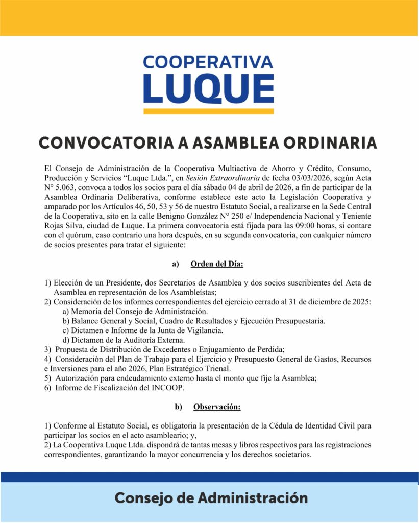 La Cooperativa Luque Ltda. convoca a sus socios a participar de la Asamblea Ordinaria Deliberativa, prevista para este sábado 4 de abril de 2026 en la sede central de la institución, ubicada en Benigno González Nº 250, esquina Independencia Nacional y Teniente Rojas Silva, en la ciudad de Luque.