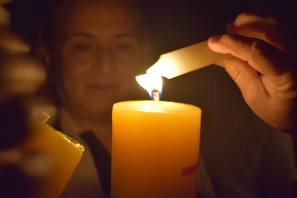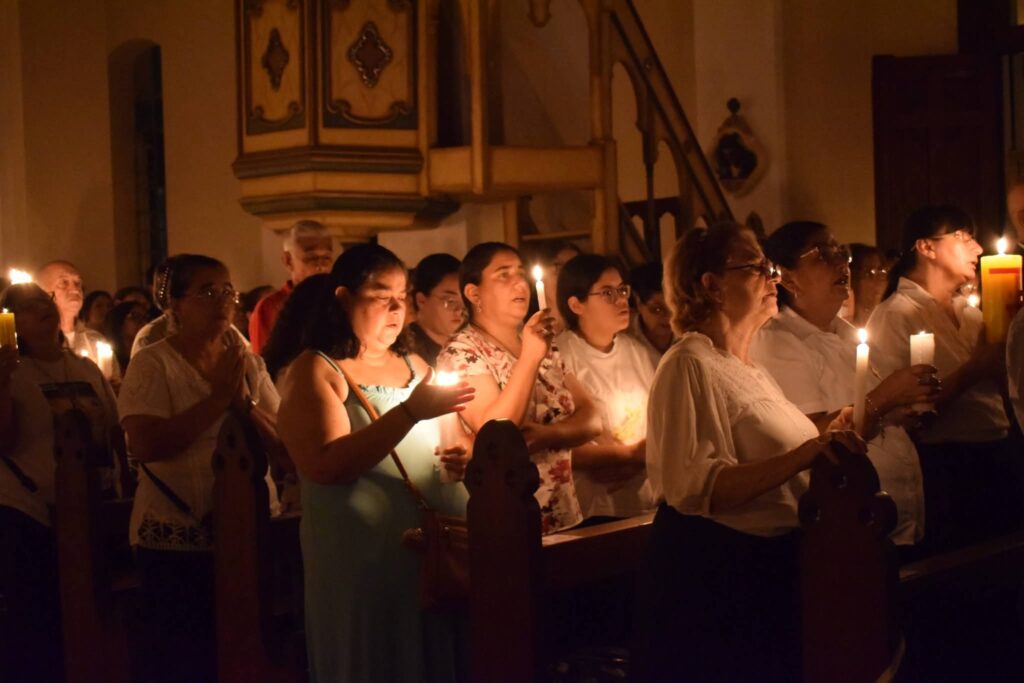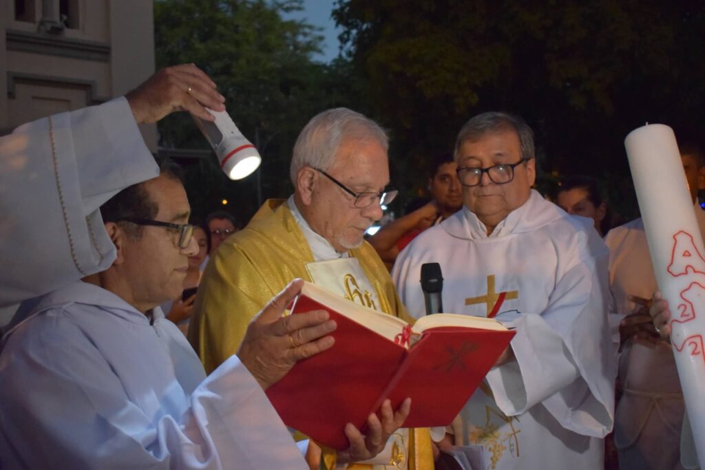 Poco después, el Cirio Pascual —símbolo de Cristo resucitado— fue ingresado al templo. De su llama los presentes encendieron sus propias velas, transformando gradualmente la oscuridad en un mar de pequeñas luces titilantes que iluminaron el santuario y crearon un ambiente de profunda oración y comunión.