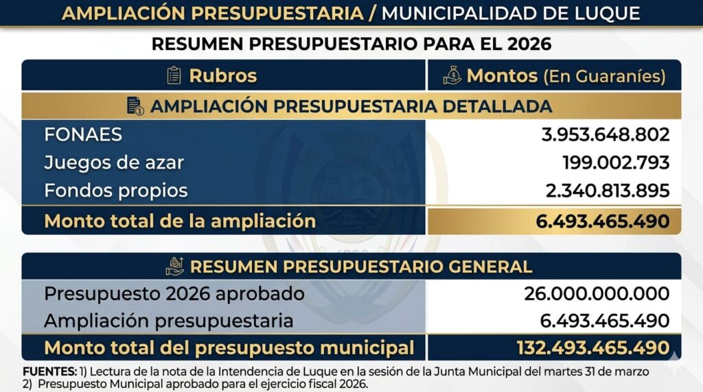 Con esta ampliación, el presupuesto total de la Municipalidad para el año 2026 registrará un incremento. El plan financiero inicialmente aprobado ascendía a G. 126.000 millones, pero con las actualizaciones y el nuevo pedido de ampliación el presupuesto consolidado se proyecta en G. 132.493.465.490.