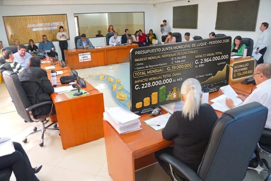 Los 12 concejales de la Junta Municipal de Luque perciben cada uno G. 19.000.000 mensuales entre dieta y gastos de representación. En total, la corporación legislativa cuesta a los contribuyentes G. 228.000.000 al mes y cerca de G. 3.000 millones al año, según datos del presupuesto municipal aprobado para el 2026.