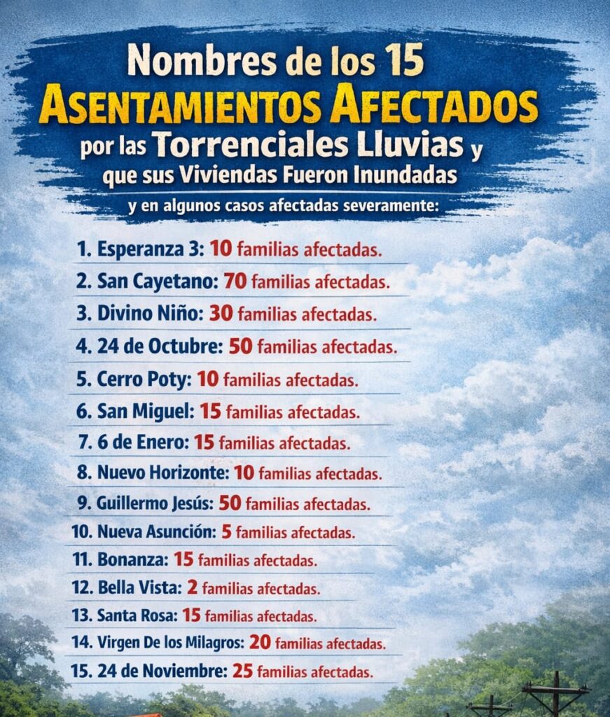 Otras comunidades afectadas incluyen: Esperanza 3 (10 familias), Divino Niño (30 familias), 24 de Octubre (50 familias), Cerro Poty (10 familias), San Miguel (15 familias), 6 de Enero (15 familias), Nuevo Horizonte (10 familias), Guillermo Jesús (50 familias), Nueva Asunción (5 familias), Bonanza (15 familias), Bella Vista (2 familias), Santa Rosa (15 familias), Virgen de los Milagros (20 familias) y 24 de Noviembre (25 familias). En todos estos asentamientos las lluvias provocaron inundaciones parciales o totales de las viviendas, dejando a muchas familias a la intemperie.